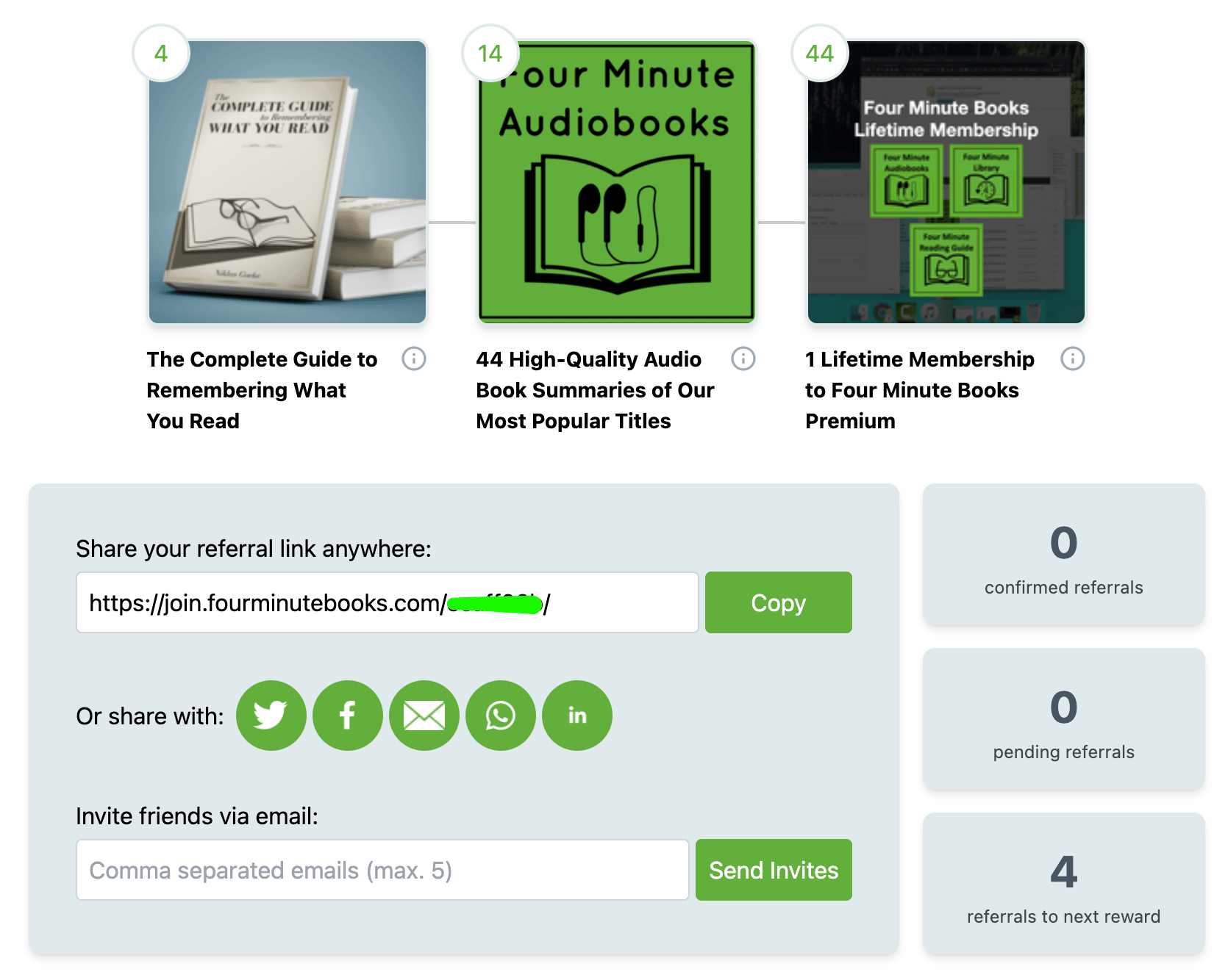 I'm sure you've seen it in my past emails or our weekly newsletter by now, but in case you haven't, here's a quick reminder: You can get access to the entire Four Minute Books premium product line for free — all you need to do is invite your friends and refer new readers!
